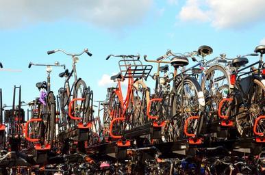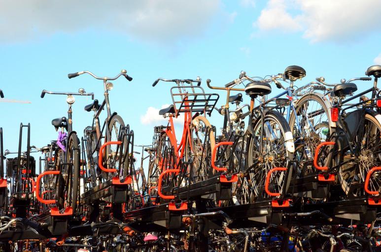 Keywords: amsterdam bicycles many full parking railway station holland netherlands city saddle road bike sky crowded mass colorful color