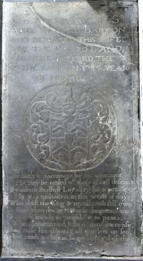 Keywords: AmyasPollardSlab1701AbbotsBickington.JPG Ledger stone of Sir Amyas Pollard 1616-1701 3rd Baronet before the altar in Abbots Bickington Church Devon Inscribed as follows To the memory of Sr Ames Pollard Barron e t who departed this life June the 5th 1701 and was here interr'd the 7th of the same in ye 85th year of his age Below is an heraldic achievement of Pollard showing an escutcheon of the Pollard arms Quarterly 1st 4th a chevron between three escallops; 2nd 3rd a chevron between three mullets; overall the Red Hand of Ulster Above the escutcheon is the crest of Pollard A leopard's head and neck erased Beneath is the following verse <br> If birth parentage be an ornament <br> His may be rank'd w i th those of best descent <br> If constant stedfast loyallty be a praise <br> His was unshaken in the worst of dayes <br> Who durst the King royall cause still own <br> In times when doing it was so dangerous known <br> If love to friends to neighb ou rs to peace <br> When constituted justice may increase <br> And raise his charact e r all this lets us see <br> How much we lost in being depriv'd of thee <br> own photo 2013 Lobsterthermidor <span class signature-talk >talk</span> 15 05 17 April 2013 UTC Interior of St James Abbots Bickington Pollard arms Ledger stones in Devon |