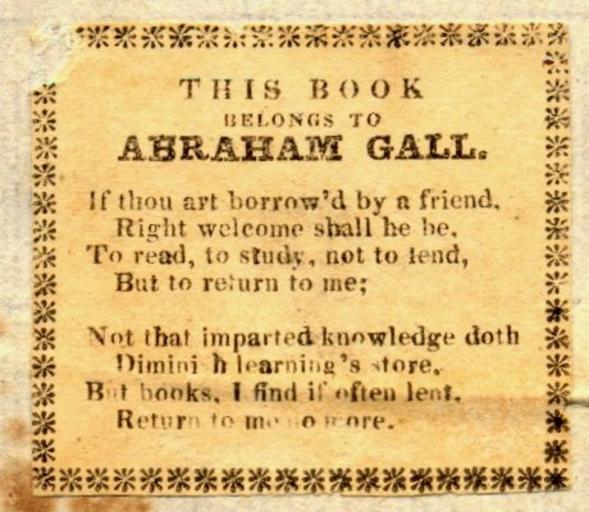 | Keywords: An ex libris poem(1741).jpg left If thou art borrow'd by a friend <br /> Right welcome shall he be <br /> To read to study not to lend <br /> But to return to me;<br /> <br /> Not that imparted knowledge doth<br /> Diminish learning's store <br /> But books I find if often lent <br /> Return to me no more אקס יבריס ע הודעה בחרוזי הקוראת מוצא הישר החזיר את הספר בע יו A new method of chemistry including the history theory and practice of the art / translated from the original Latin of Dr Boerhaave s Elementa chemiae as published by himself by Peter Shaw London T Longman 1741 upload by the http //www facebook com/NationalLibraryofIsrael National Library of Israel facebook page http //www facebook com/photo php fbid 208732815808617 set a 208732795808619 61952 140556749292891 theater http //a6 sphotos ak fbcdn net/hphotos-ak-snc6/200059_208732815808617_140556749292891_889714_4920835_n jpg dl 1 Download Abraham Gall 1741 PD-old-100 Ex libris Ex-libris of the United Kingdom |