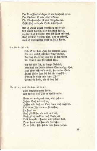 | Keywords: An Gabriele B Ringelnatz.jpg  žAn Gabriele B aus žDer Nachlaß von Joachim Ringelnatz Berlin 1935 Rowohlt Verlag S 39 Scan aus dem Original-Buch / Scan from the original book 1935 Creator Joachim Ringelnatz Copyright abgelaufen da der Autor vor über 70 Jahren verstarb / Copyright expired as author died more than 70 years ago PD-old Joachim Ringelnatz |