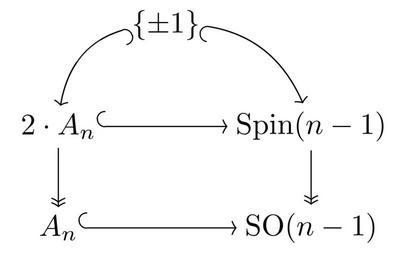 | Keywords: An-spin-representation.svg Commutative diagram showing a spin representation of the double cover of the alternating group own 2009-11-18 Nils R Barth Released into the public domain by the author TeX source TeX source produced as detailed at meta Help Displaying a formula Commutative diagrams <source lang latex > \documentclass amsart \usepackageall ps xy Loading the XY-Pic package Using postscript driver for smoother curves \usepackage color For invisible frame \begin document \thispagestyle empty No page numbers \SelectTips eu Euler arrowheads tips \setlength \fboxsep 0pt Frame box margin \color white \framebox \color black Frame for margin \xymatrix 6pt \ \pm 1\ \ar -> /_1pc/ddl \ar _ -> / 1pc/ddr \\ \\ 2 \cdot A_n \ar ->> dd \ar -> rr \operatorname Spin n-1 \ar ->> dd \\ \\ A_n \ar -> rr \operatorname SO n-1 end math end frame \end document </source> cc-zero Commutative diagrams Permutations Xy-pic diagrams Images with LaTeX source code |