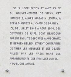 | Keywords: Anciens magasins Levitan (plaque).jpg en Plaque sur les anciens magasins de meubles Levitan 85-87 rue du faubourg Saint-Martin Paris 10th arrond The text is <br> During the German occupation of Paris and with the help of the French government of Vichy this building at that time furniture shop Levitan was an annex of the deportation camp of Drancy Here from july 1943 to august 1944 hundred of jewish people whose many were afterwards deported to the camps of Auschwitz and Bergen-Belsen were obliged to sort the furniture and the objects stolen by nazis in the flats of the jewish families Never forget fr Plaque sur les anciens magasins de meubles Levitan 85-87 rue du faubourg Saint-Martin Paris 10 e arr own Tangopaso 2011-04-29 thumb left Overview of the building 48 52 22 09 N 2 21 27 72 E region FR_heading WNW Magasins Lévitan Plaques in Paris 10e arrondissement Plaques referencing 1943 Plaques referencing 1944 in France Antisemitism in France German occupation in Paris |