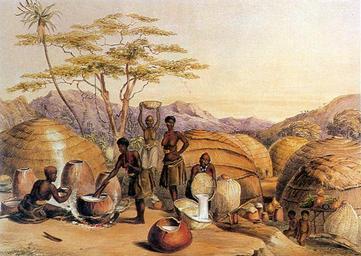 | Keywords: Angas - Zoeloe vrouens brou bier.png en Zulu women busy brewing beer They also made the earthenware which they are using af Zoeloevrouens besig om bier te brou Hulle het ook die erdeware gemaak wat hulle gebruik Stamme Ryke deur J S Bergh in samewerking met A P Bergh Don Nelson Kaapstad 1984 George F Angas Originally appeared in Angas' The Kafirs Illustrated 1849 PD-Old PD-old Zulu George French Angas Huts in Africa IQhugwane UmuZi | ||||