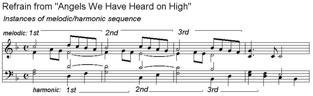 MAKE A MEME View Large Image AngelsWe Gloria.png Annotated musical notation of beginning of refrain from the Christmas carol Angels We Have Heard on High Markings illustrate how melodic/harmonic sequence occurs in music PNG file created from screen capture of notation ...