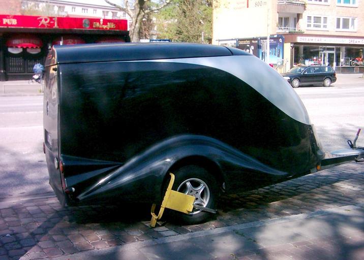 Keywords: Anhänger mit Kralle 01.jpg Anhänger gesichert mit Parkkralle Hamburg Siehe auch Image Anhänger mit Kralle 03 jpg own Own photo 2007-07 GeorgHH Own work all rights released Public domain Teardrop trailers Wheel clamps