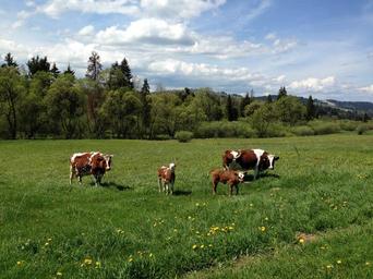 Keywords: animal cows meadow grass village animal breeding pasture land spotted mountain cows