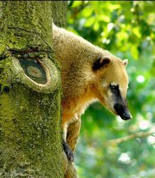 Keywords: animal nature animals bear fur animal world tree coati animal portrait head portrait hair fauna creature close snout nose datailaufnahme leaves deciduous tree bright sun colorful summer bark green tribe log