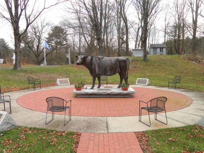Keywords: Animal Rights Memorial - Sherborn, Massachusetts - DSC02932 (cropped).JPG Monument called Sacred Cow Animal Rights Memorial in Sherborn Massachusetts The memorial is dedicated to Emily the Cow who died in 2004 <p> In 1995 Emily the Cow escaped from a slaughterhouse in Hopkinton MA by jumping a gate During her 40 days eluding capture Emily was aided by a sort of ad hoc underground railroad of townspeople She found lasting refuge at Sherborn's 'Peace Abbey ' and became a charismatic spokescow espousing a meat-free diet for humans She didn't talk but her huge eyes and friendly disposition inspired many who met her <p> When Emily died in 2004 her owners commissioned artist Lado Goudjabidze to sculpt a life-sized likeness to stand above her grave -- between statues of Mother Teresa and Gandhi Emily was buried in April 2005 and the statue was dedicated soon after on Earth Day <p> The statue is labeled as the 'Sacred Cow Animal Rights Memorial ' http //www roadsideamerica com/story/11766 Daderot 2012-01-02 11 04 03 Daderot cc0 File Animal Rights Memorial - Sherborn Massachusetts - DSC02932 JPG This version was cropped and uploaded by SlimVirgin cc0 Monuments and memorials in Sherborn Massachusetts Monuments and memorials to animal rights |