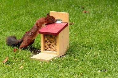 Keywords: animal squirrel sciurus foraging feed box peanuts