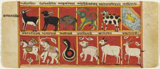 | Keywords: Animal Symbols of the Kings of the Twelve Heavens of the Vaimanika Gods.jpg en Indian and Himalayan Art Animal Symbols of the Kings of the Twelve Heavens of the Vaimanika Gods Page from a manuscript of the Sangrahanisutra Made in Gujarat India or Rajasthan India 1663-64 Artist/maker unknown India Opaque watercolor on paper 4 3/8 x 10 inches 11 1 x 25 4 cm Currently not on view 1935-34-11 26 a Purchased with the Francis T S Darley Fund 1935 Label The complex Jain cosmology expounded in the Sangrahanisutra speaks of four classes of gods the highest of which are called Vaimanika flying because they travel in airborne chariots Each of the twelve Vaimanika gods has a complete heaven ruled over by a king Each king is represented by a different animal as depicted and named in this painting They are left to right top to bottom antelope water buffalo boar elephant-lion ram swimming spotted animal horse elephant snake rhinoceros bull and gazelle Social Tags 1663-64 http //www philamuseum org/collections/permanent/194969 html mulR 17986 37 unknown India PD-old-100 Uploaded with UploadWizard Animals in art of India |