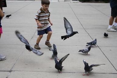 Keywords: animals child play kid birds pigeons playing beak running flying