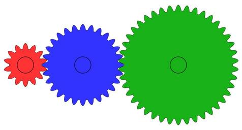 | Keywords: Animated 3 Gear Row Frame1.svg en Three gears z<sub>1</sub> 14 red ; z<sub>2</sub> 28 blue ; z<sub>3</sub> 42 green de Drei Zahnrädern z<sub>1</sub> 14 rot ; z<sub>2</sub> 28 blau ; z<sub>3</Sub> 42 grün <br /> Antrieb links Abtrieb rechts<br /> i<sub>Stufe1</sub> z<sub>2</sub> / z<sub>1</sub> 28 / 14 2<br /> i<sub>Stufe2</sub> z<sub>3</sub> / z<sub>2</sub> 42 / 28 1 5<br /> i<sub>Ges</sub> i<sub>Stufe1</sub> · i<sub>Stufe2</sub> z<sub>2</sub> · z<sub>3</sub> / z<sub>1</sub> · z<sub>2</sub> z<sub>3</sub> / z<sub>1</sub> 42 / 14 3 2016-12-11 own Jahobr other versions <gallery caption> File Animated 3 Gear Row gif animated GIF version </gallery> cc-zero Jahobr v fl Code is given in the animated version File Animated 3 Gear Row gif Drawings of gears and gearboxes Blue green red |