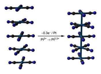 | Keywords: Anion-chains-from-cyanoplatinates-compared-3D-balls.png Ball-and-stick model of the change in anion geometry and bonding upon the oxidation of potassium tetracyanoplatinate II trihydrate by bromine K<sub>2</sub>Pt CN <sub>4</sub> 3H<sub>2</sub>O + Br<sub>2</sub> †’ K<sub>2</sub>Pt CN <sub>4</sub>Br<sub>0 3</sub>·3H<sub>2</sub>O Upon oxidation the Pt···Pt separation decreases from 3 48 Ã… to 2 89 Ã… and Pt-Pt bonds form from the overlap of 5d<sub>z</sub><sup>2</sup> orbitals creating a delocalised conducting band along the chain axes X-ray crystallographic data from http //dx doi org/10 1021/ic50155a017 Inorg Chem 1976 15 74 “78 and http //dx doi org/10 1016/0025-5408 75 90012-4 Mater Res Bull 1975 10 411-415 Model constructed in http //www crystalmaker com/ CrystalMaker 8 1 Image generated in http //accelrys com/products/discovery-studio/visualization/discovery-studio-visualizer html Accelrys DS Visualizer Own 2009-05-28 Ben Mills Benjah-bmm27 Images by Ben Mills Ball-and-stick models Cyanoplatinates |