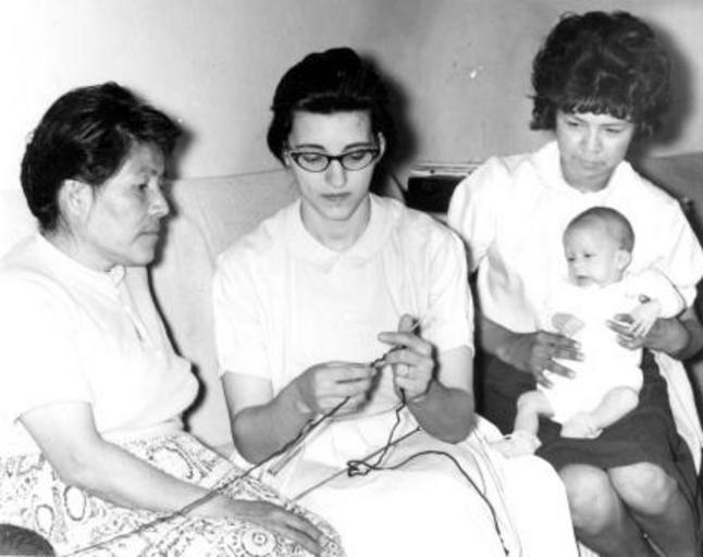 Keywords: voluntary service voluntaryservice mennonite board of missions mennoniteboardofmissions winslow arizona winslowarizona indian center indiancenter anita beidler anitabeidler polly curley pollycurley people blackandwhite monochrome indoor black and white Caption: 1964. Anita Beidler, a volunteer from Doylestown, PA., teaches Polly Curley, Winslow, AZ, to knit as part of the Ladies Club activities at the Winslow Indian Center. Stella Smith, holding Lorin Beidler, looks on. Citation: Mennonite Board of Missions. Photographs. Winslow, Arizona, Voluntary Service Units, 1900-1970. IV-10-7.2 Box 2 Folder 2, photo #11. Mennonite Church USA Archives - Goshen. Goshen, Indiana. Caption: 1964. Anita Beidler, a volunteer from Doylestown, PA., teaches Polly Curley, Winslow, AZ, to knit as part of the Ladies Club activities at the Winslow Indian Center. Stella Smith, holding Lorin Beidler, looks on. Citation: Mennonite Board of Missions. Photographs. Winslow, Arizona, Voluntary Service Units, 1900-1970. IV-10-7.2 Box 2 Folder 2, photo #11. Mennonite Church USA Archives - Goshen. Goshen, Indiana. |