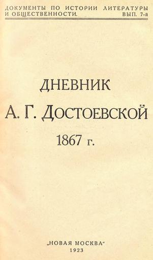 | Keywords: Anna Dostoevskaya's Diary (1867).jpg en Frontispiece of Anna Dostoevskaya's Diary in 1867 Published by New Moscow XVI 390 Anna Dostoevskaya nee Snitkina 1846-1918 was a wife of Fyodor Dostoyevsky since 1867 and his assistant Her book Anna Dostoevskaya's Diary in 1867 was published in 1923 ru « овая осква» XVI 390 Анна Г иго ьевна Достоевская у ожденная Сниткина 1846-1918 жена Ф Достоевского с 1867 помощница писателя Ее книги «Дневник А Г Достоевской 1867 г » 1923 и «Воспоминания А Г Достоевской» 1925 включают обши ный мате иал по биог афии писателя http //www rarebooks ru/ru/history/memoirs/index php id23 7345 Do not upload front cover from the same source The cover was designed by Gregory Shegal 1889 1956 so its copyright has not expired yet Anna Dostoevskaya 1846 1918 published by Novaja Moskva 1923 Anna Dostoevskaya Diaries 1867 texts 1923 books PD-old |