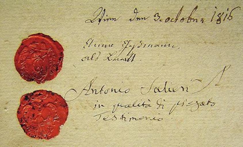 | Keywords: Anna Gassmann 3.10.1816.JPG ru Подписи и печати Анны Гассман и Антонио Салье и на б ачном конт акте Пите а Фукса 3 октяб я 1816 года A-Wsa Mag ZG A10 369/1831 1816-10-03 http //michaelorenz blogspot ru/2013/03/antonio-salieris-early-years-in-vienna html author other versions PD-Art Uploaded with UploadWizard Antonio Salieri |