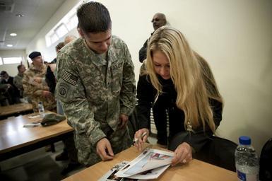 | Keywords: Anna signing autographs.jpg Tennis star Anna Kournikova signs autographs at the first stop on the 2009 USO Holiday Troop Visit in Kabul Afghanistan on Dec 14 2009 Navy Adm Mike Mullen chairman of the Joint Chiefs of Staff and his wife Deborah welcomed comedian Dave Attell tennis coach Nicholas Bollettiere and musician Billy Ray Cyrus on the tour visiting troops in Afghanistan Iraq and Germany DoD photo by Mass Communication Specialist 1st Class Chad J McNeeley/Released ID-USMil http //www flickr com/photos/thejointstaff/4184941817/ 091214-N-0696M-181 Navy 2009-12-14 12 04 Mass Communication Specialist 1st Class Chad J McNeeley U S Navy PD-USGov-Navy LicenseReview http //www flickr com/photos/thejointstaff/4184941817/ Ww2censor 2012-07-31 Anna Kournikova Soldiers International Security Assistance Force North Atlantic Treaty Organization United Service Organizations |