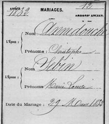 | Keywords: Annedouche marriage certificate.JPG en Certificate marriage Christophe Annedouche Marie Louise Sebin on 29 March 1832 in Paris 12th arrondissement of Paris 1832-03-29 19 12 43 http //canadp-archivesenligne paris fr/archives_etat_civil/avant_1860_fichiers_etat_civil_reconstitue/fecr_visu_img php registre V3E_M_0013 type ECRF bdd_en_cours etat_civil_rec_fichiers vue_tranche_debut AD075ER_V3E_M_00013_00451_C vue_tranche_fin AD075ER_V3E_M_00013_00501_C ref_histo 69800 cote V3E/M 2013 here p 6 NA other versions PD-old-70-1923 Christophe Annedouche |