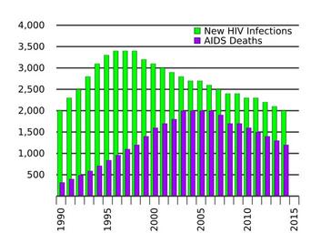 | Keywords: Annual AIDS deaths.svg translate yes en New HIV infections each year and AIDS deaths occurring during the year worldwide both in thousands; data from http //www unaids org/en/media/unaids/contentassets/documents/document/2014/2014gapreportslides/HIV2013Estimates_1990-2013_22July2014 xlsx UNAIDS GAP Report 2014 2014-10-18 own Delphi234 other versions cc-zero Uploaded with UploadWizard AIDS statistics | ||||