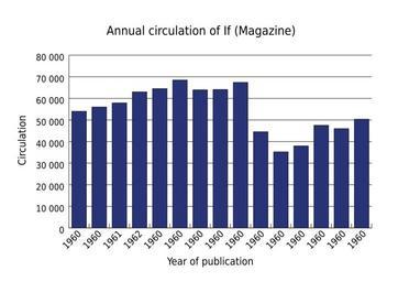 | Keywords: Annual circulation of If (magazine)-en.svg en Paid circulation figures for If from 1960 to 1974 Source data comes from the circulation statements each year as follows Note the 1974 data was printed in the February 1975 issue of Galaxy as If had merged with Galaxy Note also that the data does not necessarily come from a calendar year The statements in the February 1973 and February 1974 issues for example were sworn on the 15 of September of the previous year The circulation figures could take two or three months to come in since it was necessary to wait for returns from news stands to know what the paid circulation was Hence the information for the year marked 1972 above may actually be for a twelve-month period from about July 1971 to June 1972 fr Graphique représentant les ventes du magazine If de 1960 à 1974 Les données sources proviennent des statistiques annuelles telles que présentées ci-dessous A noter que la valeur de 1974 a été imprimée dans le magazine Galaxy en février 1975 comme celui-ci avait fusionné avec Galaxy A noter aussi que les données ne proviennent pas forcéement d'une année complète Les valeurs dans les magazines de février 1973 et février 1974 par exemple ont été arrêtées le 15 septembre de l'année précédente Le schéma de circulation pouvait mettre deux à trois mois à arriver puisqu'il était nécessaire d'attendre le retour des stands pour connaitre la circulation payante C'est pourquoi la valeur indiquée pour l'année 1972 est en réalité établie sur une période de 12 mois entre environ juillet 1971 et juin 1972 2011-09-02 own Antoine G Annual_circulation_of_If_ magazine gif Data as in Annual_circulation_of_If_ magazine gif wikitable - Year Circulation Month in which recorded Page - 1960 54000 March 1961110 - 1961 56000 March 196257 - 1962 57900 March 196321 - 1963 63000 March 196435 - 1964 64500 January 196577 - 1965 68480 March 1966159 - 1966 63930 March 196736 - 1967 64100 January 196875 - 1968 67400 January 1969158 - 1969 44548 January 197033 - 1970 35230 Jan-Feb 1971192 - 1971 37974 February 1972119 - 1972 47525 February 1973173 - 1973 45994 February 1974176 - 1974 50355 February Galaxy 158 Vector version of Annual_circulation_of_If_ magazine gif cc-zero Uploaded_with_UploadWizard If_ magazine |
