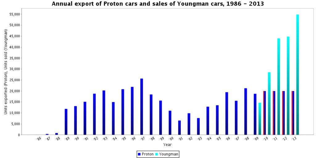 | Keywords: Annual export of Proton cars and sales of Youngman cars, 1986 - 2013 (l).png Uploaded with en wp UW marker 2014 03 10 Annual export of Proton cars and sales of Youngman cars rebadged Proton Gen-2 and Persona models 1986 - 2013 <br>As published by the Ministry of International Trade and Industry Malaysia and China Association of Automobile Manufacturers <br>Sources<br>http //goo gl/7a6Luz Annual export of Proton cars 1986 - 2009<br>http //goo gl/AcImq6 Annual sales of Youngman passenger cars 2009 May-Dec http //goo gl/no2e0O 2010 http //goo gl/bz48ez 2011 http //goo gl/tsPgrF 2012 http //goo gl/59myjO Jan-Nov http //goo gl/PngsKX 2013 Dec <br>Note<br>1 2009 sales data for Youngman cars only apply for units sold between May and December 2009 Sales data between January and April 2009 is not available <br>2 Official data for the years 2010 2011 2012 and 2013 for exported Proton cars have not been published The bar chart assumes that an average of 20 000 units are exported each year <br>3 Sales data for Youngman cars only include the rebadged Proton Gen-2 and Persona models and exclude Youngman's indigenously-designed cars <br><small>Raw data</small><br><small>Proton 25 443 861 11854 13131 15110 18788 20269 14968 20846 21891 25686 18422 15643 11022 6554 9875 7685 12870 13512 19478 15567 21261 18757 20000 20000 20000 20000<br>Youngman 0 0 0 0 0 0 0 0 0 0 0 0 0 0 0 0 0 0 0 0 0 0 0 14671 28555 43989 44778 54849</small> own 2014-03-11 Aero777 Proton automobile infographics Youngman Lotus automobiles |