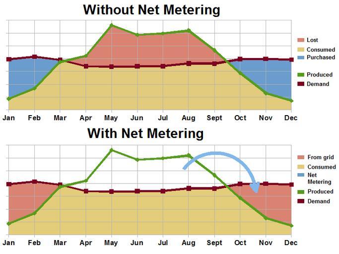 | Keywords: Annual Net Metering.png en Net metering is used on an annual basis to allow solar power generated during the summer to be used during the winter The meter runs backwards on sunny days and runs forward each night The consumer only pays for the net difference left over each month During summer months there is a surplus each month which is carried over until the fall and winter when it is consumed By spring it all equals out There are no monthly energy payments all year because the kilowatt hour credits generated during the summer are used during the winter The only charges are a connection fee to use the grid 2013-06-08 own Delphi234 cc-zero Uploaded with UploadWizard Photovoltaics |