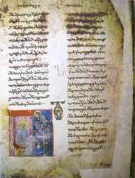 | Keywords: Annunciation. Jruchi Gospels II, H-1667, 126v, 12th c.jpg en The Annunciation A miniature from the Jruchi Gosepls II H-1667 126v 12th century National Center of Manuscripts Tbilisi Georgia Machavariani H Aleksidze Z The Decoration of Georgian Manuscripts Tbilisi 1990 Creator Unknown century 12 PD-Art-100 Miniatures of annunciation Asomtavruli letter Doni Jruchi II Gospel | ||||