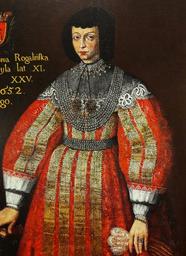 | Keywords: Anonymous Portrait of Jadwiga Rogalińska (detail).jpg Greater Poland s 1640 Oil on canvas Institution National Museum Poznań accession number object history Jadwiga of Mießków Rogalińska / she lived in marrige 11 years / and in the World 25 / Died 1652 / 8th February caption Dariusz Nowacki Magdalena Piwocka 2011 Klejnoty w dawnej Polsce Carta Blanca Grupa Wydawnicza PWN ISBN 9788377051429 other versions PD-Art-old-100 DEFAULTSORT 1640s; Jadwiga Rogalińska 17th-century unidentified painters 1640s Portraits in the National Museum in Poznań Rogaliński family 1640s portrait paintings from Poland F 17th-century oil portraits of standing women at three-quarter length 17th-century portrait paintings in Poland 17th-century portraits with coat of arms 17th-century women of Poland 1640s Coats of arms of families of Poland Female portraits holding gloves 1640s Females with red dresses in art 1640s Gold and red Golden inscriptions in portrait paintings Portrait paintings of standing women with right hand resting on table 1640s Portrait paintings of women holding books 1640s Portrait paintings of women of Poland Red dresses |