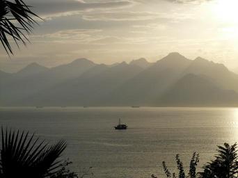 Keywords: antalya sea outlook palm trees idyll holiday ocean mountains sunset sunbeam turkey turkish riviera cliff
