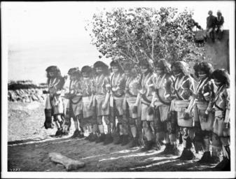 | Keywords: Antelope priests in line in front of a kiva during a Snake Dance Ceremony at Oraibi, Arizona, ca.1896 (CHS-4737).jpg en <br> Antelope priests in line in front of a kiva during a Snake Dance Ceremony at Oraibi Arizona ca 1896 Photograph of eleven antelope priests in line in front of a kiva during a Snake Dance Ceremony at Oraibi Arizona ca 1896 Their arms chests and faces are painted white They wear highly decorated skirts with scarf-like sashes moccasins necklaces feathers and animal tails In their right hands they each carry a round object perhaps an instrument A tree and a wall with three people sitting on it are visible behind the priests to the right Call number CHS-4737 Legacy record ID chs-m17048; USC-1-1-1-13888 Photographer James George Wharton Filename CHS-4737 Coverage date circa 1896 Part of collection California Historical Society Collection 1860-1960 Type images Geographic subject city or populated place Oraibi Repository name USC Libraries Special Collections Accession number 4737 Microfiche number 1-170- Archival file chs_Volume98/CHS-4737 tiff Part of subcollection Title Insurance and Trust and C C Pierce Photography Collection 1860-1960 Repository address Doheny Memorial Library Los Angeles CA 90089-0189 Geographic subject country USA Format aacr2 3 photographs glass photonegative photoprints b w ; 17 x 22 cm 21 x 26 cm Rights Digitally reproduced by the USC Digital Library; From the California Historical Society Collection at the University of Southern California Subject adlf tribal areas Project USC Repository email specol usc edu Identifying number plate no James-1341 Contributing entity California Historical Society Date created circa 1896 Publisher of the digital version University of Southern California Libraries Format aat photographic prints; photographs Geographic subject state Arizona Subject file heading Indians -- Hopi -- Snake Dance Geographic coordinates -110 639717 35 876389; -110 639442 35 876389; -110 639442 35 874722; -110 639717 35 874722; -110 639717 35 876389 Format glass plate negatives Access conditions Send requests to address or e-mail given Phone 213 821-2366; fax 213 740-2343 Geographic subject county Navajo Subject lcsh Indians of North America; Hopi Indians; Rites and ceremonies; Men circa 1896 date created George Wharton James 1858 1923 http //digitallibrary usc edu/cdm/ref/collection/p15799coll65/id/17062 PD-old-70-1923 Images from USC Digital Library uploaded by Fæ Photographs by George Wharton James California Historical Society Collection 1860-1960 Glass plate negatives |