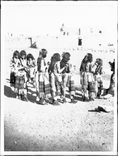 Keywords: Antelope priests marching in the Snake Dance Ceremony at Oraibi, Arizona, ca.1896 (CHS-4736).jpg en <br> Antelope priests marching in the Snake Dance Ceremony at Oraibi Arizona ca 1896 Photograph of antelope priests marching in the Snake Dance Ceremony at Oraibi Arizona ca 1896 The nine priests walk in a line Their faces chests and arms are painted white Besides moccasins necklaces and feathers they wear highly decorated skirts with scarf-like cloths tied around their waists and animal pelts hanging behind They each carry a round object perhaps an instrument their right hands Call number CHS-4736 Legacy record ID chs-m17047; USC-1-1-1-13888 Photographer James George Wharton Filename CHS-4736 Coverage date circa 1896 Part of collection California Historical Society Collection 1860-1960 Type images Geographic subject city or populated place Oraibi Repository name USC Libraries Special Collections Accession number 4736 Microfiche number 1-170- Archival file chs_Volume98/CHS-4736 tiff Part of subcollection Title Insurance and Trust and C C Pierce Photography Collection 1860-1960 Repository address Doheny Memorial Library Los Angeles CA 90089-0189 Geographic subject country USA Format aacr2 3 photographs glass photonegative photoprints b w ; 17 x 22 cm 21 x 26 cm Rights Digitally reproduced by the USC Digital Library; From the California Historical Society Collection at the University of Southern California Subject adlf tribal areas Project USC Repository email specol usc edu Identifying number plate no James-1340 Contributing entity California Historical Society Date created circa 1896 Publisher of the digital version University of Southern California Libraries Format aat photographic prints; photographs Geographic subject state Arizona Subject file heading Indians -- Hopi -- Snake Dance Format glass plate negatives Access conditions Send requests to address or e-mail given Phone 213 821-2366; fax 213 740-2343 Geographic subject county Navajo Subject lcsh Indians of North America; Hopi Indians; Rites and ceremonies; Hopi Snake Dance Ceremony circa 1896 date created George Wharton James 1858 1923 http //digitallibrary usc edu/cdm/ref/collection/p15799coll65/id/16910 PD-old-70-1923 Images from USC Digital Library uploaded by Fæ Photographs by George Wharton James California Historical Society Collection 1860-1960 Glass plate negatives |