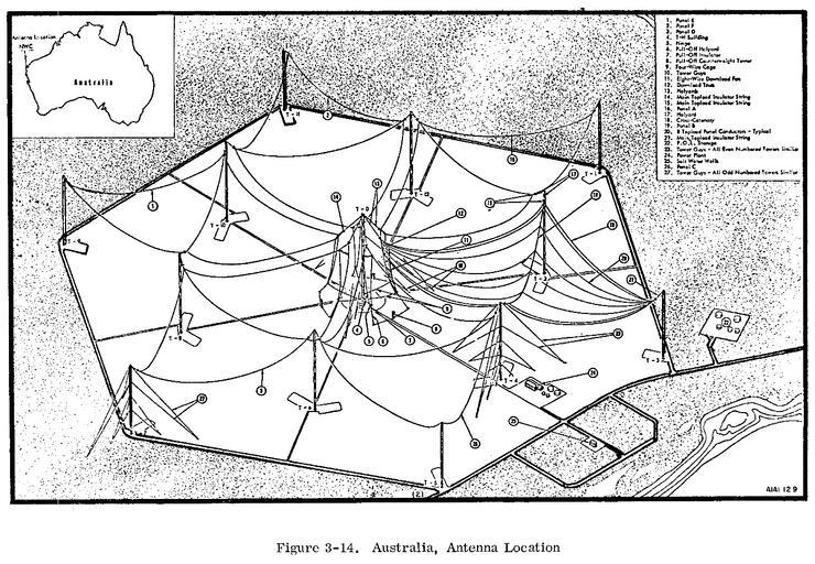 Keywords: Antenna location at the US Naval Communication Station Harold E. Holt in Exmouth, Western Australia, 1972.png Antenna location at the U S Naval Communication Station Harold E Holt in Exmouth Western Australia in 1972 This is a very low frequency VLF transmitter which communicates with submerged submarines This type of antenna is called a Trideco or umbrella antenna It consists of multiple steel masts which radiate radio waves with a network of cables attached to their tops The cables do not themselves radiate radio waves but serve as a capacitive top-load adding capacitance to the top of the antenna to make it more efficient On the ground under the antenna there is an elaborate ground system called a counterpoise consisting of radial cables in a star shape suspended a few feet above the ground NAVELEX 0101 113 Fig 3-14 1972 US Navy Naval Electronics Systems Command PD-USGov-Military-Navy Original upload log en wikipedia NAVELEX0101-113 2CFig3-14 png wikitable - 2011-04-01 17 26 1379×954× 320560 bytes Mcg410 <nowiki> Diagram of Antennas at NCS Harold E Holt NAVELEX 0101 113 Fig 3-14 1972 US Navy Naval Electronics Systems Command </nowiki> U S Naval Communication Station Harold E Holt Exmouth Western Australia |