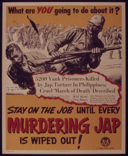 | Keywords: Anti-Japan2 original scan.png  Stay on the job until every murdering jap is wiped out World War II poster Size Size cm 53 44 <ref name uom /> Meets the Data Grid http //narademo umiacs umd edu/cgi-bin/isadg/viewobject pl object 54943 Page converted from TIFF to PNG 1944<ref name uom > cite web http //umedia lib umn edu/node/45246 What are you going to do about it 5200 Yank prisoners killed by Jap torture in Philippines; cruel; 'march of http //www webcitation org/5r3gsEpKY 2010-07-07 University of Minnesota </ref> Office for Emergency Management Office of War Information Domestic Operations Branch Bureau of Special Services PD-USGov <gallery> File Anti-Japan2 png restored version lower resolution File Anti-Japan2 University of Minnesota Libraries scan jpg other print higher resolution </gallery> References references World War II anti-Japanese propaganda posters from the United States World War II home front in the United States Prisoners in propaganda Death in propaganda War crimes in propaganda Bataan Death March |