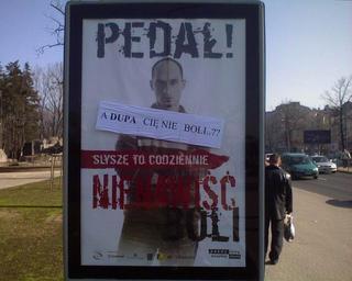 | Keywords: AntiHomoPL.jpg pl Polska Zwandalizowany plakat przeciw mowie nienawiści wobec osób homoseksualnych en Poland Anti-discrimination poster remade by the someone The text on the poster says Faggot I hear it everyday Hate hurts Someone placed piece of white paper in the middle which says Your ass doesn't hurt you My photo camera ArPol Photo has been uploaded on Polish site called wrzuta pl by me two years ago Homophobia in Poland | ||||