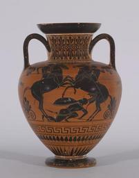 | Keywords: Antimenes Painter - Black-figure Amphora with Ajax Carrying the Dead Achilles - Walters 4817 - Side B.jpg The death of Achilles which occurred after the events recounted in The Iliad was described in another epic poem called The Aethiopis which has not survived On the front of this amphora the dead Achilles is carried from the Trojan battlefield by his comrade Ajax In front of Ajax a woman leads the way and raises her hand to tear at her hair in a gesture of mourning Two armed warriors follow behind On the back two armed horsemen clash on the battlefield their horses rearing above a fallen warrior trapped beneath them between 530 520 BC Archaic terracotta cm 38 1 27 9 accession number 48 17 18168 Don Marcello Massarenti Collection Rome before 1897 no 183 Henry Walters city Baltimore Walters Art Museum Henry Walters Acquired by Henry Walters with the Massarenti Collection 1902 Image and Word The Mitchell Gallery Annapolis 1989 Heroes Mortals and Myths in Ancient Greece The Walters Art Museum Baltimore; Frist Center for the Visual Arts Nashville; San Diego Museum Of Art San Diego; Alexander S Onassis Public Benefit Foundation USA New York 2009-2011 place of origin Attica Greece Walters Art Museum license Riders in ancient Greek pottery Antimenes Painter Ancient Greek Neck amphoras Ancient Greek black-figure pottery in the Walters Art Museum 530s BC pottery 520s BC pottery Media contributed by the Walters Art Museum needs artist update |