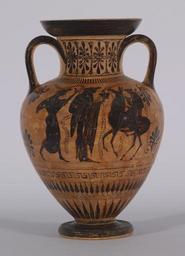 | Keywords: Antimenes Painter - Black-figure Amphora with Herakles and Apollo Fighting Over the Tripod - Walters 4821 - Side B.jpg This amphora pairs a scene of Dionysus with one of Herakles' exploits the struggle between Herakles and Apollo for the Delphic tripod According to myth Herakles traveled to the sanctuary of Apollo at Delphi to consult the oracle but when no answer was forthcoming the hero seized Apollo's tripod prompting a fight between the two Herakles draped in his lion-skin and carrying a club menaces a youthful Apollo while Herakles' protector Athena and Apollo's twin sister Artemis remain on the sidelines On the back Dionysus encounters the lame Hephaestus god of fire and metalworking riding on a donkey as a maenad looks on ca 520 BC Archaic terracotta cm 41 5 28 accession number 48 21 6825 Don Marcello Massarenti Collection Rome date and mode of acquisition unknown 1897 cat no 194 Henry Walters city Baltimore Walters Art Museum Henry Walters Acquired by Henry Walters with the Massarenti Collection 1902 Heroes Mortals and Myths in Ancient Greece The Walters Art Museum Baltimore; Frist Center for the Visual Arts Nashville; San Diego Museum Of Art San Diego; Alexander S Onassis Public Benefit Foundation USA New York 2009-2011 place of origin Attica Greece Walters Art Museum license Dionysos in ancient Greek pottery Hephaestus in ancient Greek pottery Dancing maenads in ancient Greek pottery Kantharoi in art People with donkeys in art Antimenes Painter Ancient Greek Neck amphoras Ancient Greek black-figure pottery in the Walters Art Museum 520s BC Media contributed by the Walters Art Museum needs artist update Donkeys in ancient Greek pottery |