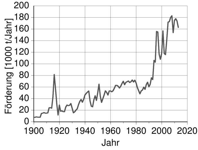 Keywords: Antimon - Trend Förderung.svg Zeitliche Entwicklung der weltweiten Antimonförderung in Tonnen pro Jahr own based http //minerals usgs gov U S Geological Survey 2007-07 Leyo Kopiersperre thumb left Antimony Metal production trends