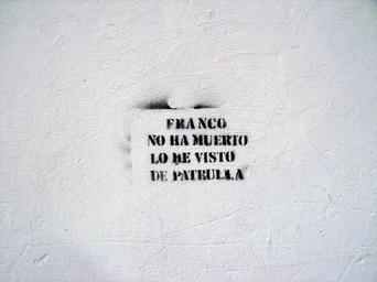 Keywords: Antipolice graffiti in Granada.JPG Franco didn't die I've seen him on patrol According to the author Police in Spain is still fascist Own 2009-01 Giorgiomonteforti Own work all rights released Public domain Graffiti in Granada