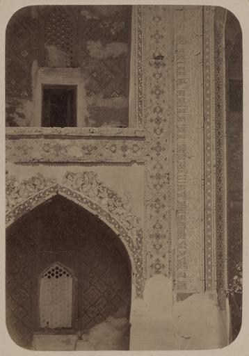 | Keywords: Antiquities of Samarkand. Inner Courtyard of the Shir Dar Madrasah (Western Side). Inscription along the Left Side of the Main Niche WDL3807.png Artwork ru Богаевский иколай Владими ович 1843 1912 гг fr Bogaevskii Nikolaï V 1843-1912 en Bogaevskii Nikolai V 1843-1912 zh 亚历山大·L· ,1840-1888 年 pt Bogaevskii Nikolai V 1843-1912 ar بوغافسكي، نيكولاي ف ، 1843-1912 es Bogaevskii Nikolai V 1843-1912 ru Сама кандские д евности Внут енний дво мед есе Ши -До западная сто она адпись по левую сто ону главной ниши fr Antiquités de Samarcande Cour intérieure de la madrasa de Shir Dar côté ouest Inscription le long du côté gauche de la niche principale en Antiquities of Samarkand Inner Courtyard of the Shir Dar Madrasah Western Side Inscription along the Left Side of the Main Niche zh 撒马尔罕古迹 尔·达伊斯兰教学校内部庭院(西侧) 主壁龛左侧铭文 pt Antiguidades de Samarcanda Pátio interno da madrassa Shir Dar lado oeste Inscrição no lado esquerdo do nicho principal ar آثار سمرقند الفناء الداخلي لمدرسة شير دار الجهة الغربية نقش بطول اللوحة اليسرى للمِشْكاة الرئيسية ru Эта фотог афия внут еннего дво а мед есе Ши -До в Сама канде Узбекистан соде жится в а хеологической части <em> Ту кестанского альбома </em> Шеститомное фотог афическое исследование было подготовлено и издано в 1871 1872 гг под пат онажем гене ала Константина П фон Кауфмана пе вого гене ал-губе нато а 1867 1882 гг Ту кестана как называли в то в емя те ито ию Цент альной Азии п инадлежавшую Российской импе ии В альбоме уделяется особое внимание исламской а хитекту е Сама канда в том числе памятникам XIV и XV вв пе иода п авления Тиму а Таме лана и его п еемников В цент е Сама канда находится ансамбль Регистан объединяющий в себе т и основных об азца <em>madrasah</em> мед есе елигиозных школ Вто ая мед есе в ансамбле Ши -До была пост оена в 1619 1636 гг во в емена династии Ашта ханидов есмот я на значительные пов еждения нанесенные мед есе в течение многих веков она остается одним из самых богато ук ашенных памятников в Цент альной Азии Фо ма этой мед есе является типичной для Цент альной Азии п ямоугольный дво ок уженный двухэтажной а кадой в кото ой находились комнаты для ученых Здесь изоб ажено пе вое п ясло на левой южной сто оне западной стены его пове хность пок ыта многоцветной плиткой майоликой Сп ава видны ве тикальные ке амические полосы об азующие южный угол а ки главного входа Слева от этих полос находится ве тикальная ке амическая полоса с надписью выполненной в укописном стиле сулюс Также видны геомет ические и цветочные узо ы <br>А хитекту ные ук ашения и деко ативные элементы; адписи; Исламская а хитекту а; ед есе; иши; Фотог афические исследования fr Cette photographie de l'intérieur de la cour de la madrasa de Shir Dar à Samarcande Ouzbékistan est extraite de l'ouvrage archéologique <em>Album du Turkestan</em> Cet inventaire photographique en six volumes fut réalisé entre 1871 et 1872 sous le patronage du général Konstantin P von Kaufman premier gouverneur général 1867-1882 du Turkestan nom donné aux territoires d'Asie centrale de l'Empire russe L'album consacre une attention particulière à l'architecture islamique de Samarcande avec notamment des monuments datant des XIV<sup>e</sup> et XV<sup>e</sup> siècles lors du règne de Tamerlan et de ses successeurs Situé au centre de Samarcande l'ensemble du Registan est composé de trois exemples majeurs de <em>madrasa</em> école religieuse La madrasa de Shir Dar seconde de l'ensemble fut construite entre 1619 et 1636 au cours de la dynastie astrakane Malgré les dommages considérables subis au cours des siècles elle demeure l'un des monuments les plus luxueusement décorés d'Asie centrale Typique de la région cette madrasa est formée d'une cour rectangulaire entourée d'une arcade à deux étages qui contient des salles réservées aux érudits Cette photographie présente la première saillie sur le côté gauche sud du mur ouest dont les surfaces sont recouvertes de carreaux de majolique polychromes Sur la droite des bandes en céramique verticales bordent l'angle sud de l'arceau de l'entrée principale leur gauche une autre bande verticale contient une écriture en style cursif thoulouth Des motifs géométriques et à fleurs sont également visibles <br>Décorations et ornements architecturaux; Inscriptions; Architecture islamique; Madrasas; Niches; Inventaires photographiques en This photograph of the interior courtyard of the Shir Dar Madrasah in Samarkand Uzbekistan i