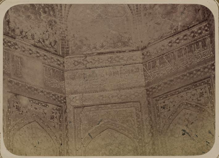 | Keywords: Antiquities of Samarkand. Inner Courtyard of the Shir Dar Madrasah. Inscriptions around the Inner Niche and Its Upper Sections. Center WDL3834.png Artwork ru Богаевский иколай Владими ович 1843 1912 гг fr Bogaevskii Nikolaï V 1843-1912 en Bogaevskii Nikolai V 1843-1912 zh 亚历山大·L· ,1840-1888 年 pt Bogaevskii Nikolai V 1843-1912 ar بوغافسكي، نيكولاي ف ، 1843-1912 es Bogaevskii Nikolai V 1843-1912 ru Сама кандские д евности Внут енний дво мед есе Ши -До адписи вдоль внут енней ниши и в ве хней ее части Се едина fr Antiquités de Samarcande Cour intérieure de la madrasa de Shir Dar Inscriptions autour de la niche intérieure et ses sections supérieures Centre en Antiquities of Samarkand Inner Courtyard of the Shir Dar Madrasah Inscriptions around the Inner Niche and Its Upper Sections Center zh 撒马尔罕古迹 尔·达伊斯兰教学校内部庭院 内部壁龛四周的铭文及壁龛的上半部分 中间部分 pt Antiguidades de Samarcanda Pátio interno da madrassa Shir Dar Inscrições em torno do nicho interno e suas seções superiores Centro ar آثار سمرقند الفناء الداخلي لمدرسة شير دار نقوش حول المِشْكاة الداخلية وأجزائها العلوية المنتصف ru Эта фотог афия внут еннего дво а мед есе Ши -До в Сама канде Узбекистан соде жится в а хеологической части <em> Ту кестанского альбома </em> Шеститомное фотог афическое исследование было подготовлено и издано в 1871 1872 гг под пат онажем гене ала Константина П фон Кауфмана пе вого гене ал-губе нато а 1867 1882 гг Ту кестана как называли в то в емя те ито ию Цент альной Азии п инадлежавшую Российской импе ии В альбоме уделяется особое внимание исламской а хитекту е Сама канда в том числе памятникам XIV и XV вв пе иода п авления Тиму а Таме лана и его п еемников В цент е Сама канда находится ансамбль Регистан объединяющий в себе т и основных об азца <em>madrasah</em> мед есе елигиозных школ Вто ая мед есе в ансамбле Ши -До была пост оена в 1619 1636 гг во в емена династии Ашта ханидов есмот я на значительные пов еждения нанесенные мед есе в течение многих веков она остается одним из самых богато ук ашенных памятников в Цент альной Азии Фо ма этой мед есе п едставляет собой п ямоугольный дво ок уженный двухэтажной а кадой а снимке видна ве хняя часть ниши <em>айвана</em> сводчатого зала с одним отк ытым концом ок уженного с т ех сто он стенами в цент е южной стены Пове хности пок ыты многоцветной плиткой майоликой об азующей сложные геомет ические и ботанические узо ы П ямоугольные панели со ст ельчатыми а ками ведут к го изонтальной полосе с надписью в укописном стиле сулюс ад надписью находятся ост оконечные а очные панели азделенные системой пе есекающихся еб истых сводов <br>А хитекту ные ук ашения и деко ативные элементы; адписи; Исламская а хитекту а; ед есе; Фотог афические исследования fr Cette photographie de l'intérieur de la cour de la madrasa de Shir Dar à Samarcande Ouzbékistan est extraite de l'ouvrage archéologique <em>Album du Turkestan</em> Cet inventaire photographique en six volumes fut réalisé entre 1871 et 1872 sous le patronage du général Konstantin P von Kaufman premier gouverneur général 1867-1882 du Turkestan nom donné aux territoires d'Asie centrale de l'Empire russe L'album consacre une attention particulière à l'architecture islamique de Samarcande avec notamment des monuments datant des XIV<sup>e</sup> et XV<sup>e</sup> siècles lors du règne de Tamerlan et de ses successeurs Situé au centre de Samarcande l'ensemble du Registan est composé de trois exemples majeurs de <em>madrasa</em> école religieuse La madrasa de Shir Dar seconde de l'ensemble fut construite entre 1619 et 1636 au cours de la dynastie astrakane Malgré les dommages considérables subis au cours des siècles elle demeure l'un des monuments les plus luxueusement décorés d'Asie centrale Cette madrasa est formée d'une cour rectangulaire entourée d'une arcade à deux étages Cette vue présente la partie supérieure de la niche de l'<em>aivan</em> salle voûtée dotée de trois murs et d'un côté ouvert au centre du mur sud Les surfaces sont recouvertes de carreaux de majolique polychromes formant des motifs géométriques et floraux complexes Les panneaux rectangulaires dotés d'arches pointues orientent le regard vers une bande d'inscription horizontale en style cursif thoulouth Au-dessus de l'inscription des panneaux sont divisés selon un système de voûtes striées entrelacées <br>Décorations et ornements architecturaux; Inscriptions; Architecture islamique