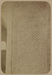 | Keywords: Antiquities of Samarkand. Madrasah of Bibi Khanym. Congregational Mosque WDL3758.png Artwork ru Богаевский иколай Владими ович 1843 1912 гг fr Bogaevskii Nikolaï V 1843-1912 en Bogaevskii Nikolai V 1843-1912 zh 亚历山大·L· ,1840-1888 年 pt Bogaevskii Nikolai V 1843-1912 ar بوغافسكي، نيكولاي ف ، 1843-1912 es Bogaevskii Nikolai V 1843-1912 ru Сама кандские д евности ед есе Биби Ханым Собо ная мечеть fr Antiquités de Samarcande Madrasa de Bibi Khanym Mosquée de congrégation en Antiquities of Samarkand Madrasah of Bibi Khanym Congregational Mosque zh 撒马尔罕古迹 比比·哈努姆伊斯兰教学校 公理会清 寺 pt Antiguidades de Samarcanda Madrassa de Bibi Khanym Mesquita congregacional ar آثار سمرقند مدرسة بيبي خانوم المسجد الجامِع ru Эта фотог афия ке амической панели фасада главной мечети ансамбля Биби Ханым в Сама канде Узбекистан соде жится в а хеологической части <em> Ту кестанского альбома </em> Шеститомное фотог афическое исследование было п оведено в 1871 1872 гг под уководством гене ала Константина П фон Кауфмана пе вого гене ал-губе нато а 1867 1882 гг Ту кестана как называли те ито ию Цент альной Азии п инадлежавшую Российской импе ии В альбоме уделяется особое внимание исламской а хитекту е Сама канда в том числе памятникам XIV и XV вв пе иода п авления Тиму а Таме лана и его п еемников Пост оенный в 1399 1405 гг с использованием т офеев индийской кампании Тиму а ансамбль Биби Ханым был местом асположения главной или пятничной мечети го ода названной в честь ста шей жены Тиму а Са ай ульк Ханым ечеть находящаяся в цент е ансамбля является одной из к упнейших в исламском ми е Вследствие асположения в активной сейсмической зоне как и всем ст оениям в ансамбле мечети был нанесен се ьезный уще б Здесь показана ке амическая панель ве хнего п авого угла фасада асположенная в п еделах ог омной а ки входа <em>iwan</em> сводчатый зал с одним отк ытым концом ок уженный с т ех сто он стенами Здесь показана се ия ке амических ук ашений включающая в себя сложные геомет ические фигу ы пок ытые куфическим письмом а также деко ативные ве тикальные полосы с геомет ическими и цветочными узо ами Слева видна <em>peshtak</em> а ка фасада над по талом ведущим в куполооб азную внут еннюю часть <br>А хитекту ные ук ашения и деко ативные элементы; Исламская а хитекту а; ина еты; ечети; Фотог афические исследования fr Cette photographie d'un panneau de céramique sur la façade de la mosquée principale de l'ensemble de Bibi Khanym à Samarcande Ouzbékistan est extraite de l'ouvrage archéologique <em>Album du Turkestan</em> Cet inventaire photographique en six volumes fut réalisé entre 1871 et 1872 sous le patronage du général Konstantin P von Kaufman premier gouverneur général 1867-1882 du Turkestan nom donné aux territoires d'Asie centrale de l'Empire russe L'album consacre une attention particulière à l'architecture islamique de Samarcande avec notamment des monuments datant des XIV<sup>e</sup> et XV<sup>e</sup> siècles lors du règne de Tamerlan et de ses successeurs Construit entre 1399 et 1405 avec le butin de la campagne de Tamerlan en Inde l'ensemble de Bibi Khanym était l'emplacement de la mosquée principale de la ville ou Mosquée du Vendredi nommée en hommage à la première épouse de Tamerlan Sarai Mulk Khanym La vaste structure de la mosquée une des plus grandes du monde islamique se trouve au centre de l'ensemble l'instar de toutes les structures de l'ensemble la mosquée a subi des dommages considérables dus à l'activité sismique de cette région Cette vue montre un panneau de céramique sur la partie supérieure droite de la façade situé dans le grand arceau de l'<em>aivan</em> salle voûtée dotée de trois murs et d'un côté ouvert de l'entrée De multiples ornements en céramique notamment des figures géométriques complexes comportant une écriture kufique angulaire et des bandes verticales décoratives de motifs géométriques et à fleurs sont illustrés ici Le <em>peshtak</em> arceau de façade est visible à gauche au-dessus du portail menant vers l'intérieur voûté <br>Décorations et ornements architecturaux; Architecture islamique; Minarets; Mosquées; Inventaires photographiques en This photograph of a ceramic panel on the facade of the main mosque at the Bibi Khanym ensemble in Samarkand Uzbekistan is from the archeological part of <em>Turkestan Album</em> The six-volume photographic survey was produced in 1871-72 under the patronage of General Konstantin P von Kaufman the first governor-general 1867-82 of Turkestan as the Russian Empire s Central Asian territories were