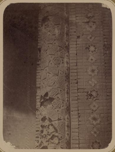 | Keywords: Antiquities of Samarkand. Madrasah of Bibi Khanym. Congregational Mosque. Section (Pillar) of a Column WDL3759.png Artwork ru Богаевский иколай Владими ович 1843 1912 гг fr Bogaevskii Nikolaï V 1843-1912 en Bogaevskii Nikolai V 1843-1912 zh 亚历山大·L· ,1840-1888 年 pt Bogaevskii Nikolai V 1843-1912 ar بوغافسكي، نيكولاي ف ، 1843-1912 es Bogaevskii Nikolai V 1843-1912 ru Сама кандские д евности ед есе Биби Ханым Собо ная мечеть Часть опо ы колонны fr Antiquités de Samarcande Madrasa de Bibi Khanym Mosquée de congrégation Coupe pilier d'une colonne en Antiquities of Samarkand Madrasah of Bibi Khanym Congregational Mosque Section Pillar of a Column zh 撒马尔罕古迹 比比·哈努姆伊斯兰教学校 公理会清 寺 柱子(支柱)的图片 pt Antiguidades de Samarcanda Madrassa de Bibi Khanym Mesquita congregacional Seção pilar de uma coluna ar آثار سمرقند مدرسة بيبي خانوم المسجد الجامِع مقطع من عمود ru Эта фотог афия ке амического элемента главной мечети ансамбля Биби Ханым в Сама канде Узбекистан соде жится в а хеологической части <em> Ту кестанского альбома </em> Шеститомное фотог афическое исследование было п оведено в 1871 1872 гг под уководством гене ала Константина П фон Кауфмана пе вого гене ал-губе нато а 1867 1882 гг Ту кестана как называли те ито ию Цент альной Азии п инадлежавшую Российской импе ии В альбоме уделяется особое внимание исламской а хитекту е Сама канда в том числе памятникам XIV и XV вв пе иода п авления Тиму а Таме лана и его п еемников Пост оенный в 1399 1405 гг с использованием т офеев индийской кампании Тиму а ансамбль Биби Ханым был местом асположения главной или пятничной мечети го ода названной в честь ста шей жены Тиму а Са ай ульк Ханым ечеть находящаяся в цент е ансамбля является одной из к упнейшей в исламском ми е Вследствие асположения в активной сейсмической зоне как и всем ст оениям в ансамбле мечети был нанесен се ьезный уще б Здесь показана вст оенная колонна асположенная с п авой сто оны ог омной а ки <em>iwan</em> сводчатый зал с одним отк ытым концом ок уженный с т ех сто он стенами кото ая об амляет <em>peshtak</em> а ка фасада частично видная слева заключающую в себе вход в главную куполооб азную ст укту у Сте жень колонны соде жит многоцветную мозаику пе есекающихся геомет ических фигу фо ми уя звездные узо ы а деко ативной полосе сп ава изоб ажены сложные восьмиконечные звезды че едующиеся с квад атной ке амической плиткой <br>А хитекту ные ук ашения и деко ативные элементы; Исламская а хитекту а; ечети; Фотог афические исследования; Каменная кладка fr Cette photographie d'un détail des céramiques de la mosquée principale de l'ensemble de Bibi Khanym à Samarcande Ouzbékistan est extraite de l'ouvrage archéologique <em>Album du Turkestan</em> Cet inventaire photographique en six volumes fut réalisé entre 1871 et 1872 sous le patronage du général Konstantin P von Kaufman premier gouverneur général 1867-1882 du Turkestan nom donné aux territoires d'Asie centrale de l'Empire russe L'album consacre une attention particulière à l'architecture islamique de Samarcande avec notamment des monuments datant des XIV<sup>e</sup> et XV<sup>e</sup> siècles lors du règne de Tamerlan et de ses successeurs Construit entre 1399 et 1405 avec le butin de la campagne de Tamerlan en Inde l'ensemble de Bibi Khanym était l'emplacement de la mosquée principale de la ville ou Mosquée du Vendredi nommée en hommage à la première épouse de Tamerlan Sarai Mulk Khanym La vaste structure de la mosquée une des plus grandes du monde islamique se trouve au centre de l'ensemble l'instar de toutes les structures de l'ensemble la mosquée a subi des dommages considérables dus à l'activité sismique de cette région Cette vue montre une colonne fixée sur le côté droit du grand arceau de l'<em>aivan</em> salle voûtée dotée de trois murs et d'un côté ouvert qui entoure le <em>peshtak</em> arceau de façade partiellement visible à gauche contenant l'entrée vers la principale structure en forme de dôme Le fût de colonne est composé d'une mosaïque polychrome de figures géométriques s'entrecroisant et formant des motifs d'étoiles droite la bande décorative est ornée d'étoiles à huit branches complexes alternant avec des carreaux de céramique <br>Décorations et ornements architecturaux; Architecture islamique; Mosquées; Inventaires photographiques; Travail de la pierre en This photograph of a ceramic detail at the main mosque of the Bibi Khanym ensemble in Samarkand Uzbekistan is from the archeological part of