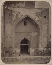 | Keywords: Antiquities of Samarkand. Madrasah of Tillia Kari. Inner Courtyard (Western Side). Entrance to the Congregational Mosque (Friday Mosque) WDL3851.png Artwork ru Богаевский иколай Владими ович 1843 1912 гг fr Bogaevskii Nikolaï V 1843-1912 en Bogaevskii Nikolai V 1843-1912 zh 亚历山大·L· ,1840-1888 年 pt Bogaevskii Nikolai V 1843-1912 ar بوغافسكي، نيكولاي ف ، 1843-1912 es Bogaevskii Nikolai V 1843-1912 ru Сама кандские д евности ед есе Тилля-Ка и Внут енний дво западная сто она Вход в собо ную мечеть мечеть джами fr Antiquités de Samarcande Madrasa de Tillia Kari Cour intérieure côté ouest Entrée de la mosquée de congrégation mosquée du Vendredi en Antiquities of Samarkand Madrasah of Tillia Kari Inner Courtyard Western Side Entrance to the Congregational Mosque Friday Mosque zh 撒马尔罕古迹 季里雅·卡利伊斯兰教学校 内部庭院(西侧) 大清 寺(星 五清 寺)的入口 pt Antiguidades de Samarcanda Madrassa de Tillia Kari Pátio interno lado ocidental Entrada da mesquita congregacional mesquita de sexta-feira ar آثار سمرقند مدرسة تِلْيَا كَرِى الفناء الداخلي الجانب الغربي مدخل المسجد الجامع مسجِد الجُمعة ru Эта фотог афия мечети в мед есе Тилля-Ка и в Сама канде Узбекистан соде жится в а хеологической части <em> Ту кестанского альбома </em> Шеститомное фотог афическое исследование было подготовлено и издано в 1871 1872 гг под пат онажем гене ала Константина П фон Кауфмана пе вого гене ал-губе нато а 1867 1882 гг Ту кестана как называли в то в емя те ито ию Цент альной Азии п инадлежавшую Российской импе ии В альбоме уделяется особое внимание исламской а хитекту е Сама канда в том числе памятникам XIV и XV вв пе иода п авления Тиму а Таме лана и его п еемников В цент е Сама канда находится ансамбль Регистан объединяющий в себе т и основных об азца <em>madrasah</em> мед есе елигиозных школ Т етья часть Регистана мед есе Тилля-Ка и была пост оена в 1646 1660 гг на месте бывшего ка аван-са ая а фотог афии показан фасад и вход в мечеть с а кой <em>айвана</em> сводчатого зала с одним отк ытым концом ок уженного с т ех сто он стенами асполагающийся на западной стене есмот я на значительные пов еждения фасад пок ыт богатыми ке амическими ук ашениями в том числе п иставными колоннами в боковых и внут енних углах а также панелями из плитки майолики со сложными геомет ическими и ботаническими узо ами а фасаде также видны деко ативные узо ы из куфических букв об азующих слова из основанной на калиме шахады исламской декла ации ве ы ад по талом находится полоса с надписью в укописном стиле Све ху на этом снимке частично виден цилинд подде живающий купол <br>А хитекту ные ук ашения и деко ативные элементы; Исламская а хитекту а; ечети; иши; Фотог афические исследования fr Cette photographie de la mosquée de la madrasa de Tillia Kari à Samarcande Ouzbékistan est extraite de l'ouvrage archéologique <em>Album du Turkestan</em> Cet inventaire photographique en six volumes fut réalisé entre 1871 et 1872 sous le patronage du général Konstantin P von Kaufman premier gouverneur général 1867-1882 du Turkestan nom donné aux territoires d'Asie centrale de l'Empire russe L'album consacre une attention particulière à l'architecture islamique de Samarcande avec notamment des monuments datant des XIV<sup>e</sup> et XV<sup>e</sup> siècles lors du règne de Tamerlan et de ses successeurs Situé au centre de Samarcande l'ensemble du Registan est composé de trois exemples majeurs de <em>madrasa</em> école religieuse Le troisième composant du Registan la madrasa de Tillia Kari fut construit entre 1646 et 1660 sur le site d'un ancien caravansérail Cette vue présente la façade et l'<em>aivan</em> salle voûtée dotée de trois murs et d'un côté ouvert à l'entrée de la mosquée situés sur le mur ouest Malgré les dommages considérables la façade arbore des décorations en céramique notamment des colonnes fixées aux angles latéraux et intérieurs ainsi que des panneaux de lambris dotés de carreaux de majolique formant des motifs géométriques et à fleurs La façade comporte également des motifs ornementaux composés de lettres coufiques formant des mots de la kalima fondement de la chahada et profession de foi islamique Une bande d'inscription en écriture cursive surplombe l'entrée Le cylindre soutenant le dôme est partiellement visible dans la partie supérieure de cette vue <br>Décorations et ornements architecturaux; Architecture islamique; Mosquées; Niches; Inventaires photographiques en This photograph of the mosque at the Till