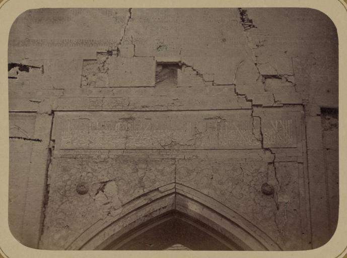 | Keywords: Antiquities of Samarkand. Madrasah of Ulugh Beg. Main Facade (Eastern). Middle of the Inscription WDL3862.png Artwork ru Богаевский иколай Владими ович 1843 1912 гг fr Bogaevskii Nikolaï V 1843-1912 en Bogaevskii Nikolai V 1843-1912 zh 亚历山大·L· ,1840-1888 年 pt Bogaevskii Nikolai V 1843-1912 ar بوغافسكي، نيكولاي ف ، 1843-1912 es Bogaevskii Nikolai V 1843-1912 ru Сама кандские д евности ед есе Улугбека Главный фасад восточный Се едина надписи fr Antiquités de Samarcande Madrasa d'Ulugh Beg Façade principale est Milieu de l'inscription en Antiquities of Samarkand Madrasah of Ulugh Beg Main Facade Eastern Middle of the Inscription zh 撒马尔罕古迹 鲁伯· 格伊斯兰教学校 主立 ( 侧) 铭文的中间部分 pt Antiguidades de Samarcanda Madrassa de Ulugh Beg Fachada principal lado leste Meio da inscrição ar آثار سمرقند مدرسة أُلوك بيك الواجهة الرئيسية الشرقية الجزء الأوسط من النقش ru Эта фотог афия ф агмента восточного фасада мед есе Улугбека в Сама канде Узбекистан соде жится в а хеологической части <em> Ту кестанского альбома </em> Шеститомное фотог афическое исследование было подготовлено и издано в 1871 1872 гг под пат онажем гене ала Константина П фон Кауфмана пе вого гене ал-губе нато а 1867 1882 гг Ту кестана как называли в то в емя те ито ию Цент альной Азии п инадлежавшую Российской импе ии В альбоме уделяется особое внимание исламской а хитекту е Сама канда в том числе памятникам XIV и XV вв пе иода п авления Тиму а Таме лана и его п еемников В цент е Сама канда находится ансамбль Регистан объединяющий в себе т и основных об азца <em>madrasah</em> мед есе елигиозных школ Самое ста ое мед есе площади Регистан пост оенное в 1417 1420 гг названо в честь п авителя-ученого Улугбека 1393 1449 гг внука Тиму а ед есе в течение долгого в емени считалось ведущим цент ом исламского об азования а фотог афии видна ст ельчатая каменная а ка над по талом внут и ниши ог омной а ки <em>айвана</em> сводчатого зала с одним отк ытым концом ок уженного с т ех сто он стенами в кото ой находится вход во дво мед есе есмот я на значительные пов еждения нанесенные фасаду на ф агменте видны многоцветные ке амические ук ашения в том числе сложные геомет ические фигу ы по обеим сто онам а ки а также цветочные мотивы и завитки ке амическая надпись пе сидско-а абским письмом в укописном стиле Такие под обные фотог афии свидетельствуют о п иве женности тщательному изучению исламских памятников <br>А хитекту ные ук ашения и деко ативные элементы; адписи; Исламская а хитекту а; ед есе; Фотог афические исследования fr Cette photographie d'un détail de la façade est de la madrasa d'Ulugh Beg à Samarcande Ouzbékistan est extraite de l'ouvrage archéologique <em>Album du Turkestan</em> Cet inventaire photographique en six volumes fut réalisé entre 1871 et 1872 sous le patronage du général Konstantin P von Kaufman premier gouverneur général 1867-1882 du Turkestan nom donné aux territoires d'Asie centrale de l'Empire russe L'album consacre une attention particulière à l'architecture islamique de Samarcande avec notamment des monuments datant des XIV<sup>e</sup> et XV<sup>e</sup> siècles lors du règne de Tamerlan et de ses successeurs Situé au centre de Samarcande l'ensemble du Registan est composé de trois exemples majeurs de <em>madrasa</em> école religieuse La madrasa la plus ancienne existant encore sur la place du Registan porte le nom du roi-astronome et petit-fils de Tamerlan Ulugh Beg vers 1393-1449 qui la construisit entre 1417 et 1420 La madrasa fut longtemps considérée comme un centre important de l'éducation islamique Cette vue présente l'arceau pointu en pierre situé au-dessus d'un portail à l'intérieur de la niche du grand arceau de l'<em>aivan </em> salle voûtée dotée de trois murs et d'un côté ouvert qui contenait l'entrée menant vers la cour de la madrasa Malgré les dommages sur la façade ce segment arbore des ornements en céramique polychrome notamment des figures géométriques complexes de part et d'autre de l'arceau ainsi que des motifs à fleurs et de vrilles Une inscription horizontale de céramique sophistiquée en écriture cursive perso-arabe surplombe l'arceau Les photographies détaillées comme celle présentée ici révèlent le dévouement pour l'étude minutieuse des monuments islamiques <br>Décorations et ornements architecturaux; Inscriptions; Architecture islamique; Madrasas; Inventaires photographiques en This photograph of a detail of the east facade of the Ulugh Beg Madrasah in Samarkand Uzbekis