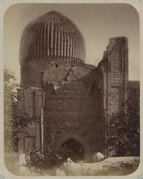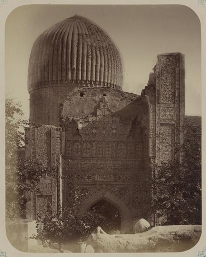 | Keywords: Antiquities of Samarkand. Mausoleum of Emir Timur Kuragan. View of the Northern Facade of the Mausoleum WDL3729.png Artwork ru Богаевский иколай Владими ович 1843 1912 гг fr Bogaevskii Nikolaï V 1843-1912 en Bogaevskii Nikolai V 1843-1912 zh 亚历山大·L· ,1840-1888 年 pt Bogaevskii Nikolai V 1843-1912 ar بوغافسكي، نيكولاي ف ، 1843-1912 es Bogaevskii Nikolai V 1843-1912 ru Сама кандские д евности авзолей эми а Тиму а Ку агана Вид севе ного фасада мавзолея fr Antiquités de Samarcande Mausolée de l'émir Timour Kuragan Vue de la façade nord du mausolée en Antiquities of Samarkand Mausoleum of Emir Timur Kuragan View of the Northern Facade of the Mausoleum zh 撒马尔罕古迹 埃米尔帖 儿·库拉甘的陵墓 陵墓北立 景象 pt Antiguidades de Samarcanda Mausoléu de Tamerlão Vista da fachada norte do mausoléu ar آثار سمرقند ضريح الأمير تيمور كوراغان منظر للواجهة الشمالية للضريح ru Эта фотог афия мавзолея Гу -Эми в Сама канде Узбекистан соде жится в а хеологической части <em> Ту кестанского альбома </em> Шеститомное фотог афическое исследование было подготовлено и издано в 1871 1872 гг под пат онажем гене ала Константина П фон Кауфмана пе вого гене ал-губе нато а 1867 1882 гг Ту кестана как называли в то в емя те ито ию Цент альной Азии п инадлежавшую Российской импе ии В альбоме уделяется особое внимание исламскому а хитекту ному наследию Сама канда включая Гу -Эми на пе сидском языке означает г обница повелителя Гу -Эми известен в пе вую оче едь как место захо онения Тиму а Таме лана хотя Тиму начал его ст оительство еще в 1403 г в память о своем любимом внуке ухаммаде Султане кото ый в конце XIV века пост оил на этом месте <em>мед есе</em> елигиозную школу и <em>ханака</em> мемо иальный комплекс После похо он Тиму а в 1405 г Гу -Эми стал мавзолеем Тиму идов а этом снимке севе ного фасада мавзолея видны следы аз ушительного воздействия в емени с еди кото ых об ушившаяся ве хняя часть большой а ки <em>айвана</em> сводчатого зала с одним отк ытым концом ок уженного с т ех сто он стенами Тем не менее сох анилась значительная часть богатых многоцветных ке амических ук ашений в том числе плиточная облицовка ебе главного купола Особенно сильное впечатление п оизводят боковые сто оны а ки и фасад ее ниши пок ытые фаянсовыми панелями со сложными ботаническими и геомет ическими фигу ами ад ст ельчатой а кой по тала видны надписи удлиненным пе сидско-а абским письмом <br>Купола; Исламская а хитекту а; Фотог афические исследования; огильные памятники; Тиму 1336-1405 гг ; Г обницы fr Cette photographie du mausolée de Gour Emir à Samarcande Ouzbékistan est extraite de l'ouvrage archéologique <em>Album du Turkestan</em> Cet inventaire photographique en six volumes fut réalisé entre 1871 et 1872 sous le patronage du général Konstantin P von Kaufman premier gouverneur général 1867-1882 du Turkestan nom donné aux territoires d'Asie centrale de l'Empire russe L'album consacre une attention particulière à l'héritage de l'architecture islamique de Samarcande notamment Gour Emir « tombe du souverain » en persan Bien qu'il soit principalement connu comme étant le lieu de sépulture de Tamerlan Gour Emir fut commencé sous Tamerlan en 1403 pour commémorer la mort de son petit-fils bien-aimé le sultan Mahomet qui avait construit une <em>madrasa</em> école religieuse et un <em>khanaka</em> grand ensemble commémoratif sur le site à la fin du XIV<sup>e</sup> siècle Avec l'enterrement de Tamerlan en 1405 Gour Emir devint en fait le mausolée des Timourides Cette vue présente la façade nord du mausolée ayant subi des dommages considérables au cours des siècles notamment l'effondrement de la partie supérieure de l'arceau de l'immense <em>aivan</em> salle voûtée dotée de trois murs et d'un côté ouvert Toutefois une grande partie du riche ornement en céramique polychrome existe encore aujourd'hui y compris des parties du revêtement de carreaux sur les côtes du dôme principal Les côtés de l'arceau et la façade de sa niche recouverts de panneaux de faïence décorés de figures géométriques et à fleurs sophistiquées sont particulièrement impressionnants Des inscriptions en caractères perso-arabes allongés sont visibles au-dessus de l'arceau pointu de l'entrée <br>Coupoles; Architecture islamique; Inventaires photographiques; Monuments funéraires; Tamerlan 1336-1405; Tombes en This photograph of the Gur-Emir mausoleum in Samarkand Uzbekistan is from the archeological part of <em>Turkestan Album</em> The six-volume photographic survey was produ