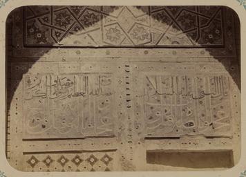 | Keywords: Antiquities of Samarkand. Mausoleum of Tuman-Aka Nuri. Inscription in the External Niche of the Nuri Mausoleum WDL3740.png Artwork ru Богаевский иколай Владими ович 1843 1912 гг fr Bogaevskii Nikolaï V 1843-1912 en Bogaevskii Nikolai V 1843-1912 zh 亚历山大·L· ,1840-1888 年 pt Bogaevskii Nikolai V 1843-1912 ar بوغافسكي، نيكولاي ف ، 1843-1912 es Bogaevskii Nikolai V 1843-1912 ru Сама кандские д евности авзолей Туман-Ака у и адпись в на ужной нише мавзолея у и fr Antiquités de Samarcande Mausolée de Tuman-Aka Nuri Inscriptions dans la niche extérieure du mausolée de Nuri en Antiquities of Samarkand Mausoleum of Tuman-Aka Nuri Inscription in the External Niche of the Nuri Mausoleum zh 撒马尔罕古迹 图曼-阿卡·努丽陵墓 努丽陵墓外壁龛中的铭文 pt Antiguidades de Samarcanda Mausoléu de Tuman-Aka Nuri Inscrição no nicho externo do mausoléu de Nuri ar آثار سمرقند ضريح تومان-أغا نوري نقوش على المِشْكاة الخارجية لضريح نوري ru Эта фотог афия элемента фасада мавзолея Туман-Ака в нек ополе Шах-Зиндэ в Сама канде соде жится в а хеологической части <em> Ту кестанского альбома </em> Шеститомное фотог афическое исследование было подготовлено и издано в 1871 1872 гг под пат онажем гене ала Константина П фон Кауфмана пе вого гене ал-губе нато а 1867 1882 гг Ту кестана как называли в то в емя те ито ию Цент альной Азии п инадлежавшую Российской импе ии В альбоме уделяется особое внимание исламской а хитекту е Сама канда в том числе памятникам XIV и XV вв пе иода п авления Таме лана и его п еемников Особенно следует отметить ансамбль Шах-Зиндэ на пе сидском языке означает «живой ца ь» кото ый почитается как мемо иал Куссама ибн Абасса двою одного б ата п о ока ухаммада авзолей и мечеть Туман-Ака пост оенные в 1405 г как мемо иал в честь младшей жены Таме лана п имыкают к <em>ча таку</em> в севе ной г уппе г обниц авзолей выделяется я кими ке амическими ук ашениями кото ые по цвету ва ьи уются от темно-синего до желтого фиолетового и би юзового Его мозаичные панели п едставляют собой ве шину масте ства в использовании а хитекту ной ке амики в данном егионе а снимке показан ф агмент фасада с геомет ическими узо ами и надписями адписи в укописном стиле сулюс обычно основанные на текстах Ко ана также указывают имя пе сидского масте а создавшего их Шейха ухаммада ибн Хаджа Бандги ат-Туг а Таб изи <br>А хеологические объекты; адписи; Исламская а хитекту а; Фотог афические исследования; огильные памятники; Шах-Зиндэ; Г обницы fr Cette photographie d'un détail de façade du mausolée de Tuman-Aka dans la nécropole de Shah-i Zindah à Samarcande est extraite de l'ouvrage archéologique <em>Album du Turkestan</em> Cet inventaire photographique en six volumes fut réalisé entre 1871 et 1872 sous le patronage du général Konstantin P von Kaufman premier gouverneur général 1867-1882 du Turkestan nom donné aux territoires d'Asie centrale de l'Empire russe L'album consacre une attention particulière à l'architecture islamique de Samarcande avec notamment des monuments datant des XIV<sup>e</sup> et XV<sup>e</sup> siècles lors du règne de Tamerlan et de ses successeurs L'ensemble de Shah-i Zindah « roi vivant » en persan est un mémorial dédié à la vénération de Kusam-ibn-Abbas cousin du prophète Mahomet Bâtis en 1405 comme mémorial dédié à la plus jeune épouse de Tamerlan le mausolée et la mosquée de Tuman-Aka sont adjacents au <em>chartak</em> au nord des sanctuaires Le mausolée se distingue par ses ornements en céramique exceptionnels dotés de couleurs incluant le bleu foncé le noir le jaune le violet et le bleu turquoise Plus particulièrement ses panneaux de mosaïque représentent l'apogée de la céramique architecturale de la région Le fragment de façade présenté ici contient des motifs géométriques et épigraphiques Les inscriptions thoulouth en style cursif généralement inspirées des textes coraniques permettent d'identifier le maître persan les ayant créées le cheikh Muhammed ibn Khadja Bandgir at-Tugra Tabrizi <br>Sites archéologiques; Inscriptions; Architecture islamique; Inventaires photographiques; Monuments funéraires; Shāh-i Zindah; Tombes en This photograph of a facade detail at the Tuman-Aka mausoleum in the Shah-i Zindah necropolis in Samarkand is from the archeological part of <em>Turkestan Album</em> The six-volume photographic survey was produced in 1871-72 under the patronage of General Konstantin P von Kaufman the first governor-general in 1867-82 of Turkestan as the Russian Empire s Central Asian territories were called The album devotes special attention to Samarkand s Is