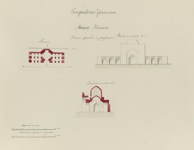 | Keywords: Antiquities of Samarkand. Namazga Mosque. Plan, Elevation, and Sections WDL3582.png Artwork ru Богаевский иколай Владими ович 1843 1912 гг fr Bogaevskii Nikolaï V 1843-1912 en Bogaevskii Nikolai V 1843-1912 zh 亚历山大·L· ,1840-1888 年 pt Bogaevskii Nikolai V 1843-1912 ar بوغافسكي، نيكولاي ف ، 1843-1912 es Bogaevskii Nikolai V 1843-1912 ru Сама кандские д евности ечеть амазга План фасад и аз езы fr Antiquités de Samarcande Mosquée de Namazga Plan élévation et sections en Antiquities of Samarkand Namazga Mosque Plan Elevation and Sections zh 撒马尔罕古迹 那玛伽清 寺 平 图 立 图和截 图 pt Antiguidades de Samarcanda Mesquita Namazga Plano elevação e seções ar آثار سمرقند مسجد نمازجا التصميم والمسقط الأمامي والمقاطع ru Этот план фасад и аз ез мечети амазга в Сама канде Узбекистан соде жится в а хеологической части <em> Ту кестанского альбома </em> Шеститомное фотог афическое исследование было п оведено в 1871 1872 гг под уководством гене ала Константина П фон Кауфмана пе вого гене ал-губе нато а 1867 1882 гг Ту кестана как называли те ито ию Цент альной Азии п инадлежавшую Российской импе ии В альбоме уделяется особое внимание исламскому а хитекту ному наследию Сама канда ечеть <em>намазга</em> была специально п едназначена для п азднования Ид аль-Фит а п аздника кото ый отмечается в конце месяца Рамадана а также Ку бана или Ид аль-Адха п аздника же твоп иношения Самая аняя намазга в Сама канде возможно дати уется XI веком Восстановленная Тиму идами в XV веке обветшалая мечеть была пе ест оена в пе вой половине XVII века ади ом Диван-Беги визи ем и дядей буха ского п авителя Иман-Кули Хана Расположенная на южной ок аине го ода эта ве сия мечети амазга была заве шена п име но в 1630-х гг Цент альное куполооб азное ст оение мечети ок ужено одноэтажными сводчатыми гале еями каждая из кото ых имеет шесть низких куполов В цент е главного фасада асположен большой а очный <em>айван</em> сводчатый зал с одним отк ытым концом ок уженный с т ех сто он стенами об амляющий вход в главное ст оение Рисунок аз еза показывает что внут енняя часть венчается низким сводчатым куполом над кото ым возвышается высокий купол азмещенный на цилинд е или ба абане <br>А хитекту ные че тежи; Исламская а хитекту а; ечети; П оекции fr Ce plan cette section et élévation de la mosquée de Namazga à Samarcande Ouzbékistan sont extraits de l'ouvrage archéologique <em>Album du Turkestan</em> Cet inventaire photographique en six volumes fut réalisé entre 1871 et 1872 sous le patronage du général Konstantin P von Kaufman premier gouverneur général 1867-1882 du Turkestan nom donné aux territoires d'Asie centrale de l'Empire russe L'album consacre une attention particulière à l'héritage de l'architecture islamique de Samarcande Une mosquée <em>namazga</em> était spécifiquement destinée à marquer l'Aïd al-Fitr fête célébrée à la fin du jeûne du ramadan ainsi que le Kurban ou l'Aïd al-Adha la fête du sacrifice La namazga d'origine de Samarcande date probablement du début du XI<sup>e</sup> siècle Malgré sa reconstruction par les Timourides au XV<sup>e</sup> siècle la mosquée délabrée fut remplacée lors de la première moitié du XVII<sup>e</sup> siècle par Nadir Divan-Begi vizir et oncle du souverain de Bukhara Iman-Quli Khan Située au sud de la ville cette version de la mosquée de Namazga fut achevée en 1630 environ Sa structure centrale dotée d'un dôme est encadrée de galeries en arcade à un étage chacune comprenant six dômes peu élevés Au centre de la façade principale apparaît un grand <em>aivan</em> salle voûtée dotée de trois murs et d'un côté ouvert qui entoure l'entrée menant vers la structure principale La vue en coupe illustre l'intérieur qui est surplombé d'un dôme voûté peu élevé au-dessus duquel un grand dôme sur un cylindre ou tambour émerge <br>Dessins architecturaux; Architecture islamique; Mosquées; Projections en This plan section and elevation of the Namazga Mosque in Samarkand Uzbekistan is from the archeological part of <em>Turkestan Album</em> The six-volume photographic survey was produced in 1871-72 under the patronage of General Konstantin P von Kaufman the first governor-general 1867-82 of Turkestan as the Russian Empire s Central Asian territories were called The album devotes special attention to Samarkand s Islamic architectural heritage A <em>namazga</em> mosque was specifically intended to mark Eid al-Fitr a holiday observed at the end of the Ramadan fast as well as Kurban or Eid al-Adha the Festival of Sacrifice In Samarkand the original namazga dated to perhaps as early as the 11th century Al