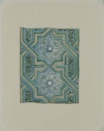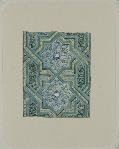 | Keywords: Antiquities of Samarkand. Tomb of the Saint Kusam-ibn-Abbas (Shah-i Zindah) and Adjacent Mausoleums. Mausoleum of Sha Arap. Sections of Detail on the Facade WDL3924.png Artwork ru Шостак Л А fr Shostak L A en Shostak L A zh L A ·斯塔克 pt Shostak L A ar شوستاك، ل أ es Shostak L A ru Сама кандские д евности Г обница святого Куссама ибн Абасса Шах-Зиндэ и мавзолеи п и ней авзолей Ша-А ап Части отделки фасада fr Antiquités de Samarcande Sépulcre de Kusam-ibn-Abbas Shah-i Zindah et mausolées adjacents Mausolée de Sha Arap Sections d'un détail de la façade en Antiquities of Samarkand Tomb of the Saint Kusam-ibn-Abbas Shah-i Zindah and Adjacent Mausoleums Mausoleum of Sha Arap Sections of Detail on the Facade zh 撒马尔罕古迹 库萨姆-伊 -阿巴斯之墓(夏伊辛达)及其邻近陵墓 沙·阿拉普的陵墓 部分立 细节 pt Antiguidades de Samarcanda Túmulo do Santo Kusam-ibn-Abbas Shah-i Zindah e mausoléus adjacentes Mausoléu de Sha Arap Seções de um detalhe da fachada ar آثار سمرقند ضَرِيح الوَلِيّ قثم بن عباس شاه زنده والأضرحة المجاورة ضريح شاء آراب أجزاء من أحد تفاصيل الواجهة ru Данный эскиз деко ативного ф агмента фасада неизвестного мавзолея асположенного в севе ной г уппе усыпальниц нек ополя Шах-Зиндэ Сама канд Узбекистан соде жится в а хеологической части <em> Ту кестанского альбома </em> Шеститомное фотог афическое исследование было подготовлено и издано в 1871 1872 гг под пат онажем гене ала Константина П фон Кауфмана пе вого гене ал-губе нато а 1867 1882 гг Ту кестана как называли в то в емя те ито ию Цент альной Азии п инадлежавшую Российской импе ии В альбоме уделяется особое внимание исламской а хитекту е Сама канда в том числе памятникам XIV и XV вв пе иода п авления Тиму а Таме лана и его п еемников Особенно следует отметить ансамбль Шах-Зиндэ на пе сидском языке означает живой ца ь кото ый пост оен на возвышенности бывшей местом д евнего поселения известного как Аф асиаб Шах-Зиндэ почитается как мемо иал Куссама ибн Абасса двою одного б ата п о ока ухаммада Заказчик этого мавзолея окончательно не оп еделен однако дата его ст оительства известна 1360 1361 гг есмот я на то что соо ужение было се ьезно пов еждено значительная часть его богатого ке амического деко а уцелела Для ук ашения фасада использовались п еимущественно би юзовый и темно-синий цвета в сочетании с белой отделкой а данном исунке изоб ажен ф агмент езной глазу ованной те акотовой полосы на левой сто оне фасада Ее узо состоит из пе есекающихся линий об азующих восьмиконечные звезды внут и кото ых асположены сложные лиственные мотивы и завитки с цветком или звездой в цент е <br>А хитекту ные ук ашения и деко ативные элементы; Исламская а хитекту а; огильные памятники; Шах-Зиндэ; Г обницы; Аква ельные исунки fr Cette esquisse d'un fragment décoratif de la façade d'un mausolée non identifié situé au nord de l'ensemble des sanctuaires de la nécropole de Shah-i Zindah à Samarcande Ouzbékistan est extraite de l'ouvrage archéologique <em>Album du Turkestan</em> Cet inventaire photographique en six volumes fut réalisé entre 1871 et 1872 sous le patronage du général Konstantin P von Kaufman premier gouverneur général 1867-1882 du Turkestan nom donné aux territoires d'Asie centrale de l'Empire russe L'album consacre une attention particulière à l'architecture islamique de Samarcande avec notamment des monuments datant des XIV<sup>e</sup> et XV<sup>e</sup> siècles lors du règne de Tamerlan et de ses successeurs Il convient de souligner que l'ensemble de Shah-i Zindah « roi vivant » en persan fut construit sur le site élevé d'une ancienne colonie connue sous le nom d'Afrosiabe et qu'il était dédié à la vénération de Kusam-ibn-Abbas cousin du prophète Mahomet Bien que le commanditaire de ce mausolée n'ait pas été identifié avec certitude on a pu déterminer qu'il fut bâti entre 1360 et 1361 Malgré d importants dégâts plusieurs des nombreux ornements en céramique du mausolée ont subsisté Les principales couleurs de la façade sont le bleu turquoise et le bleu foncé avec une bordure blanche Cette vue montre un segment d une bande en terre cuite vernissée et sculptée sur le côté gauche de la façade Le motif se compose de bandes entrecroisées qui forment des étoiles à huit branches dont l intérieur est garni de motifs de vrille et de feuillage avec une fleur ou une étoile au centre <br>Décorations et ornements architecturaux; Architecture islamique; Mo