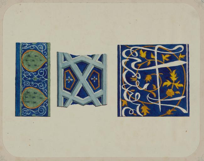 | Keywords: Antiquities of Samarkand. Tomb of the Saint Kusam-ibn-Abbas (Shah-i Zindah) and Adjacent Mausoleums. Mausoluem of Emir Assad. Tiles from Varying Sections of the Mausoleum of Emir Assad WDL3929.png Artwork ru Шостак Л А fr Shostak L A en Shostak L A zh L A ·斯塔克 pt Shostak L A ar شوستاك، ل أ es Shostak L A ru Сама кандские д евности Г обница святого Куссама ибн Абасса Шах-Зиндэ и мавзолеи п и ней авзолей эми а Ассада Плитка из азных частей мавзолея эми а Ассада fr Antiquités de Samarcande Sépulcre de Kusam-ibn-Abbas Shah-i Zindah et mausolées adjacents Mausolée de l'émir Assad Carreaux de différentes sections du mausolée de l émir Assad en Antiquities of Samarkand Tomb of the Saint Kusam-ibn-Abbas Shah-i Zindah and Adjacent Mausoleums Mausoluem of Emir Assad Tiles from Varying Sections of the Mausoleum of Emir Assad zh 撒马尔罕古迹 库萨姆-伊 -阿巴斯之墓(夏伊辛达)及其邻近陵墓 埃米尔·阿萨德的陵墓 自埃米尔·阿萨德陵墓不同部分的瓷砖 pt Antiguidades de Samarcanda Túmulo do Santo Kusam-ibn-Abbas Shah-i Zindah e mausoléus adjacentes Mausoléu do Emir Assad Azulejos de diversas seções do mausoléu do Emir Assad ar آثار سمرقند ضَرِيح الوَلِيّ قثم بن عباس شاه زنده والأضرحة المجاورة ضريح الأمير أسد بلاط من مختلف أجزاء ضريح الأمير أسد ru Эти аква ельные исунки с изоб ажением ке амического о намента из неизвестного мавзолея асположенного на те ито ии нек ополя Шах-Зиндэ в Сама канде соде жатся в а хеологической части <em> Ту кестанского альбома </em> Шеститомное фотог афическое исследование было подготовлено и издано в 1871 1872 гг под пат онажем гене ала Константина П фон Кауфмана пе вого гене ал-губе нато а 1867 1882 гг Ту кестана как называли в то в емя те ито ию Цент альной Азии п инадлежавшую Российской импе ии В альбоме уделялось особое внимание исламской а хитекту е Сама канда в том числе памятникам XIV и XV вв пе иода п авления Таме лана и его п еемников Отдельно следует отметить ансамбль Шах-Зиндэ на пе сидском языке означает живой ца ь кото ый почитается как мемо иал Куссама ибн Абасса двою одного б ата п о ока ухаммада Т и изоб аженных на исунке ф агмента относятся к безымянному мавзолею у кото ого аз ушена основная конст укция и значительная часть главного фасада П и этом сох анившиеся ф агменты ке амики на фасаде по своей деко ативной технике похожи на ук ашения из соседнего мавзолея Усто Али около 1380 г Слева п едставлена часть полосы с о наментом кото ый состоит из изоб ажений лотоса с пе еплетающимися завитками В цент е асположен ф агмент майолики с ельефными полосами об азующими геомет ический узо Сп ава изоб ажен ф агмент многоцветной полосы со священной надписью на а абском языке выполненной в укописном стиле сулюс в сочетании с изящным узо ом из пе еплетающихся завитков и листьев <br>А хитекту ные ук ашения и деко ативные элементы; Исламское искусство; огильные памятники; Шах-Зиндэ; озаика; Г обницы; Аква ельные исунки fr Ces esquisses à l'aquarelle d'un ornement en céramique dans un mausolée non identifié situé dans la nécropole de Shah-i Zindah à Samarcande est extraite de l'ouvrage archéologique <em>Album du Turkestan</em> Cet inventaire photographique en six volumes fut réalisé entre 1871 et 1872 sous le patronage du général Konstantin P von Kaufman premier gouverneur général 1867-1882 du Turkestan nom donné aux territoires d'Asie centrale de l'Empire russe L'album consacre une attention particulière à l'architecture islamique de Samarcande avec notamment des monuments datant des XIV<sup>e</sup> et XV<sup>e</sup> siècles lors du règne de Tamerlan et de ses successeurs Il convient de souligner que Shah-i Zindah « roi vivant » en persan est un mémorial dédié à la vénération de Kusam-ibn-Abbas cousin du prophète Mohamed Les trois fragments présentés ici appartiennent à un mausolée non identifié dont la structure de base et une grande partie de sa façade principale se sont effondrées Toutefois les céramiques encore existantes sur la façade révèlent une approche décorative semblable à celle du mausolée d'Usto Ali à proximité en 1380 environ gauche une partie d une bande ornementale est formée par des images de lotus encadrées avec des vrilles entrelacées Au centre les lignes en relief du fragment de majolique forment des dessins géométriques croisés droite un segment d une bande polychrome est constitué d une inscription sacrée en écritu