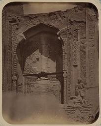 Keywords: Antiquities of Samarkand. Tomb of the Saint Kusam-ibn-Abbas (Shah-i Zindah) and Adjacent Mausoleums. Mausoleum of Tamerlane's Daughter, Toglu Tekin. View of the Front WDL3641.png Artwork ru Богаевский иколай Владими ович 1843 1912 гг fr Bogaevskii Nikolaï V 1843-1912 en Bogaevskii Nikolai V 1843-1912 zh 亚历山大·L· ,1840-1888 年 pt Bogaevskii Nikolai V 1843-1912 ar بوغافسكي، نيكولاي ف ، 1843-1912 es Bogaevskii Nikolai V 1843-1912 ru Сама кандские д евности Г обница святого Куссама ибн Абасса Шах-Зиндэ и мавзолеи п и ней авзолей доче и Таме лана Туглу-Текин Вид спе еди fr Antiquités de Samarcande Sépulcre de Kusam-ibn-Abbas Shah-i Zindah et mausolées adjacents Mausolée de la fille de Tamerlan Toglu Tekin Vue de la façade en Antiquities of Samarkand Tomb of the Saint Kusam-ibn-Abbas Shah-i Zindah and Adjacent Mausoleums Mausoleum of Tamerlane's Daughter Toglu Tekin View of the Front zh 撒马尔罕古迹 库萨姆-伊 -阿巴斯之墓(夏伊辛达)及其邻近陵墓 帖 儿女儿托格鲁·特金的陵墓 正 景象 pt Antiguidades de Samarcanda Túmulo do Santo Kusam-ibn-Abbas Shakhi Zinda e mausoléus adjacentes Mausoléu da filha de Tamerlão Toglu Tekin Imagem frontal ar آثار سمرقند ضَرِيح الوَلِيّ قثم بن عباس شاه زنده والأضرحة المجاورة ضريح ابنة تَيْمورلِنك، توغلو-تكين صورة للمقدمة ru Эта фотог афия фасада мавзолея Туглу-Текин эми а Хуссейна в нек ополе Шах-Зиндэ в Сама канде соде жится в а хеологической части <em> Ту кестанского альбома </em> Шеститомное фотог афическое исследование было подготовлено и издано в 1871 1872 гг под пат онажем гене ала Константина П  фон Кауфмана пе вого гене ал-губе нато а 1867 1882 гг Ту кестана как называли в то в емя те ито ию Цент альной Азии п инадлежавшую Российской импе ии В альбоме уделяется особое внимание исламской а хитекту е Сама канда в том числе памятникам XIV и XV вв пе иода п авления Тиму а Таме лана и его п еемников Шах-Зиндэ на пе сидском языке означает живой ца ь почитается как мемо иал Куссама ибн Абасса двою одного б ата п о ока ухаммада В 1386 г эми Хуссейн один из п иближенных Таме лана пост оил мавзолей для своей мате и Туглу-Текин а фотог афии снятой из-за па апета кото ый частично заго аживает вид изоб ажена ве хняя часть главного фасада с входной а кой или <em>пештаком</em> есмот я на се ьезные пов еждения нанесенные силами п и оды большая часть фасада и богатых ке амических ук ашений сох анилась ногоцветные ук ашения включают езные колонны из глазу ованной те акоты по углам а ки ве тикальные полосы из плитки майолики с изысканными геомет ическими узо ами а также полосы с а абскими надписями в укописном стиле сулюс внут и сложного пе еплетающегося цветочного о намента Человек в тю бане п истально наблюдает за фотог афом <br>А хеологические объекты; А хитекту ные ук ашения и деко ативные элементы; Исламская а хитекту а; Фотог афические исследования; огильные памятники; Шах-Зиндэ; Г обницы fr Cette photographie de la façade du mausolée de Toglu Tekin émir Hussein situé dans la nécropole de Shah-i Zindah à Samarcande est extraite de l'ouvrage archéologique <em>Album du Turkestan</em> Cet inventaire photographique en six volumes fut réalisé entre 1871 et 1872 sous le patronage du général Konstantin P von Kaufman premier gouverneur général 1867-1882 du Turkestan nom donné aux territoires d'Asie centrale de l'Empire russe L'album consacre une attention particulière à l'architecture islamique de Samarcande avec notamment des monuments datant des XIV<sup>e</sup> et XV<sup>e</sup> siècles lors du règne de Tamerlan et de ses successeurs L'ensemble de Shah-i Zindah « roi vivant » en persan est un mémorial dédié à la vénération de Kusam-ibn-Abbas cousin du prophète Mahomet En 1386 l'émir Hussein un des notables de Tamerlan fit construire un mausolée pour sa mère Toglu Tekin Cette photographie prise de derrière un parapet qui obstrue partiellement la vue présente la partie supérieure de la façade principale et son arceau d'entrée ou <em>peshtak</em> Malgré des dommages considérables dus à des causes naturelles la majeure partie de la façade et de ses riches décorations de céramique existe encore aujourd'hui Les ornements polychromes incluent des colonnes en terre cuite sculptée et vernissée aux angles de l'arceau des bandes verticales de carreaux de majolique formant des motifs géométriques sophistiqués ainsi que des bandes d'inscriptions ornées d'une écriture cursive arabe en styl